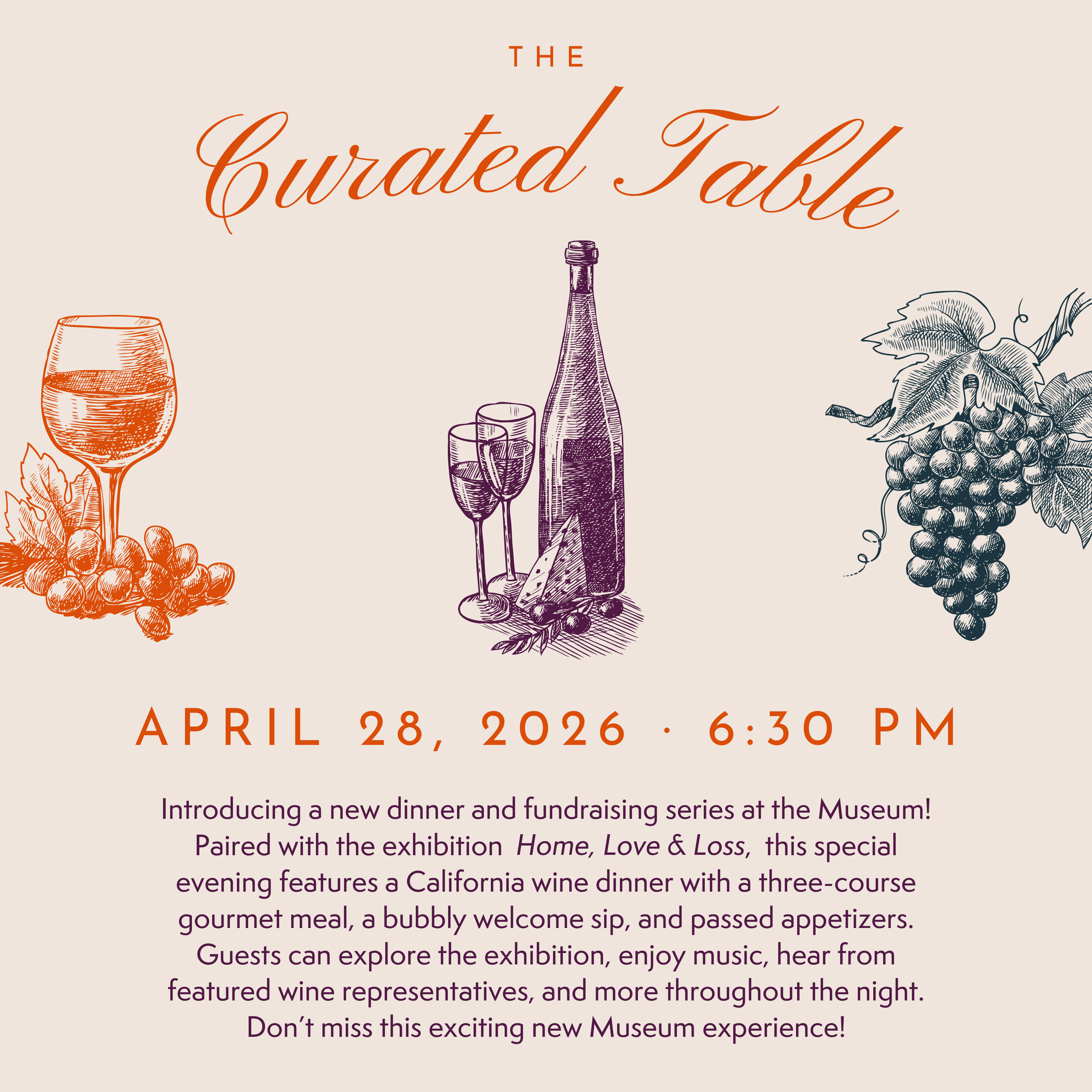 Introducing a new dinner and fundraising series at the Museum! Paired with the exhibition Home, Love, and Loss, this special evening features a California wine dinner with a three-course gourmet meal and appetizers. Guests can explore the exhibition, enjoy music, hear from featured wine representatives, and more!
